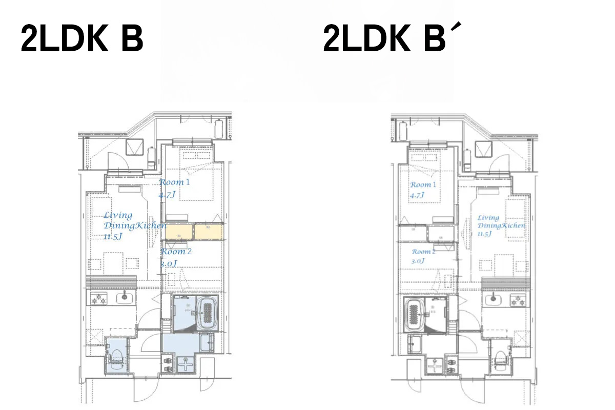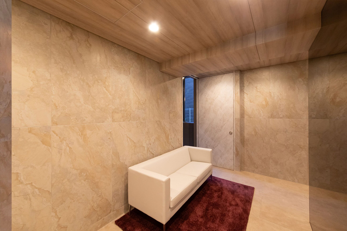 外観は、明と暗のコントラストがシャープで都会的な印象を与えます。明るいライトグレーの外壁タイルと、落ち着いたベランダのブロンズガラス。さらには2色カラーをランダムに配した縦ルーバーが、高級感と洗練された雰囲気を際立たせます。